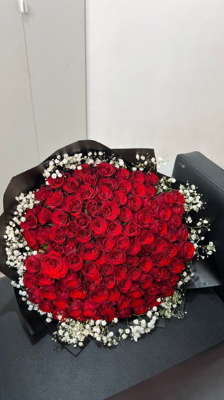 This luxurious bouquet features an opulent cluster of premium red roses, artfully arranged with delicate sprays of Gypsophila (baby’s breath) and wrapped in sleek black paper for a dramatic contrast. Each rose is carefully selected for its lush bloom and vibrant hue, making this arrangement the perfect gesture of love, admiration, or celebration.